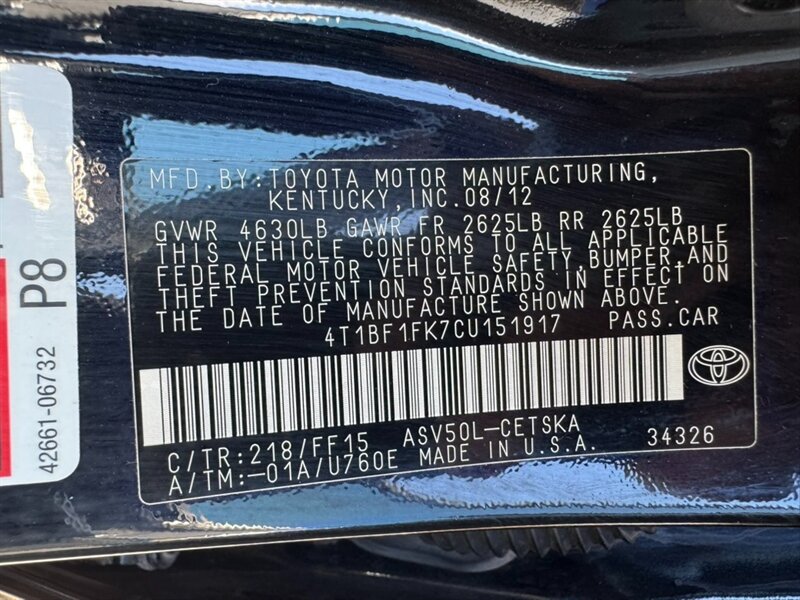 This 2012 Toyota Camry SE boasts a reliable 2.5L I4 engine, delivering 178hp and 170ft. lbs. of torque. As a factory default, this sedan comes equipped with a range of features including keyless entry, power windows, cruise control, Bluetooth connectivity, and a USB port for multimedia access. Its comfortable interior, smooth ride, and excellent overall condition make it a desirable option for those seeking a dependable daily driver. Additionally, the clean CARFAX report and single ownership history add to the appeal of this well-maintained vehicle.