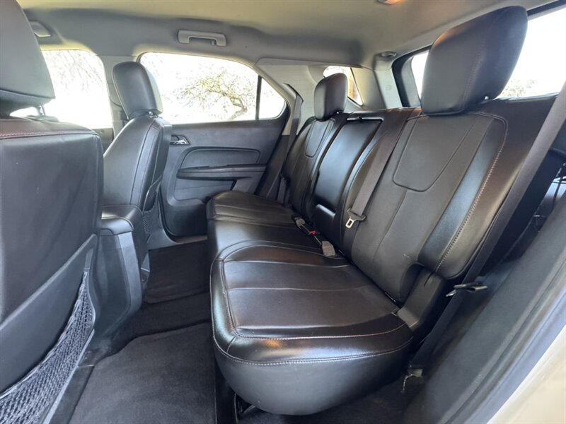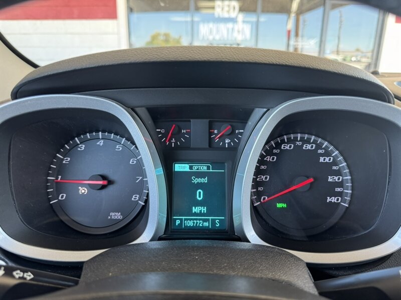 2015 Chevrolet Equinox LT powered by a 2.4L I4 engine producing 182 hp and 172 lb-ft of torque, paired with a 6-speed automatic transmission and standard front-wheel drive. Factory standard equipment includes cloth seating, power windows and door locks, remote keyless entry, cruise control, Bluetooth hands-free phone and audio streaming, AM/FM/CD audio with USB and auxiliary inputs, steering-wheel audio controls, 60/40 split-folding rear seats for versatile cargo space, air conditioning, and alloy wheels. Safety systems include ABS, traction and stability control, and multiple airbags. This vehicle is in excellent overall condition, has under 107,000 miles (averaging less than 9,000 miles per year), a clean CARFAX, and a single prior owner.